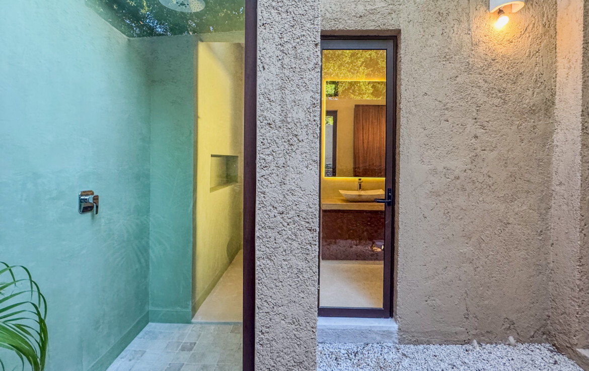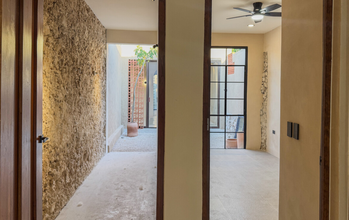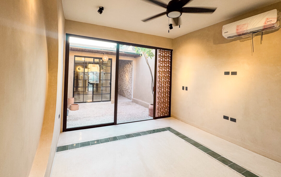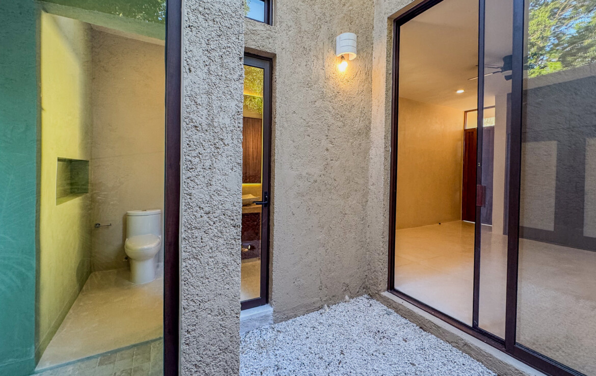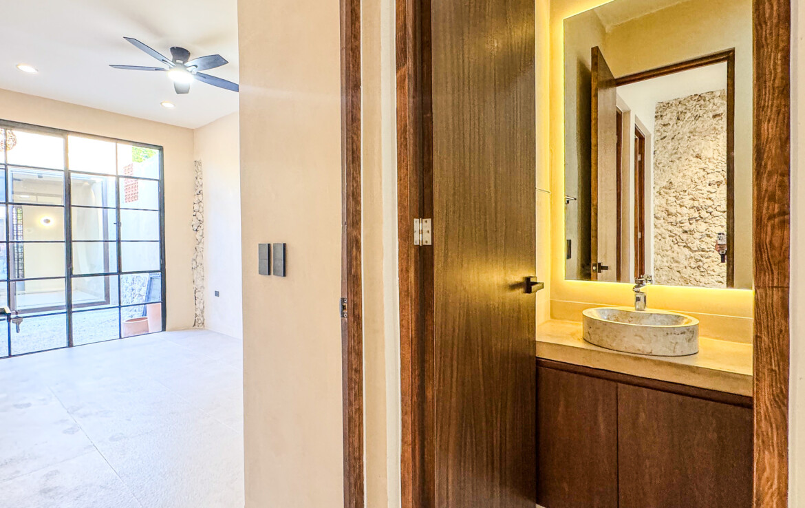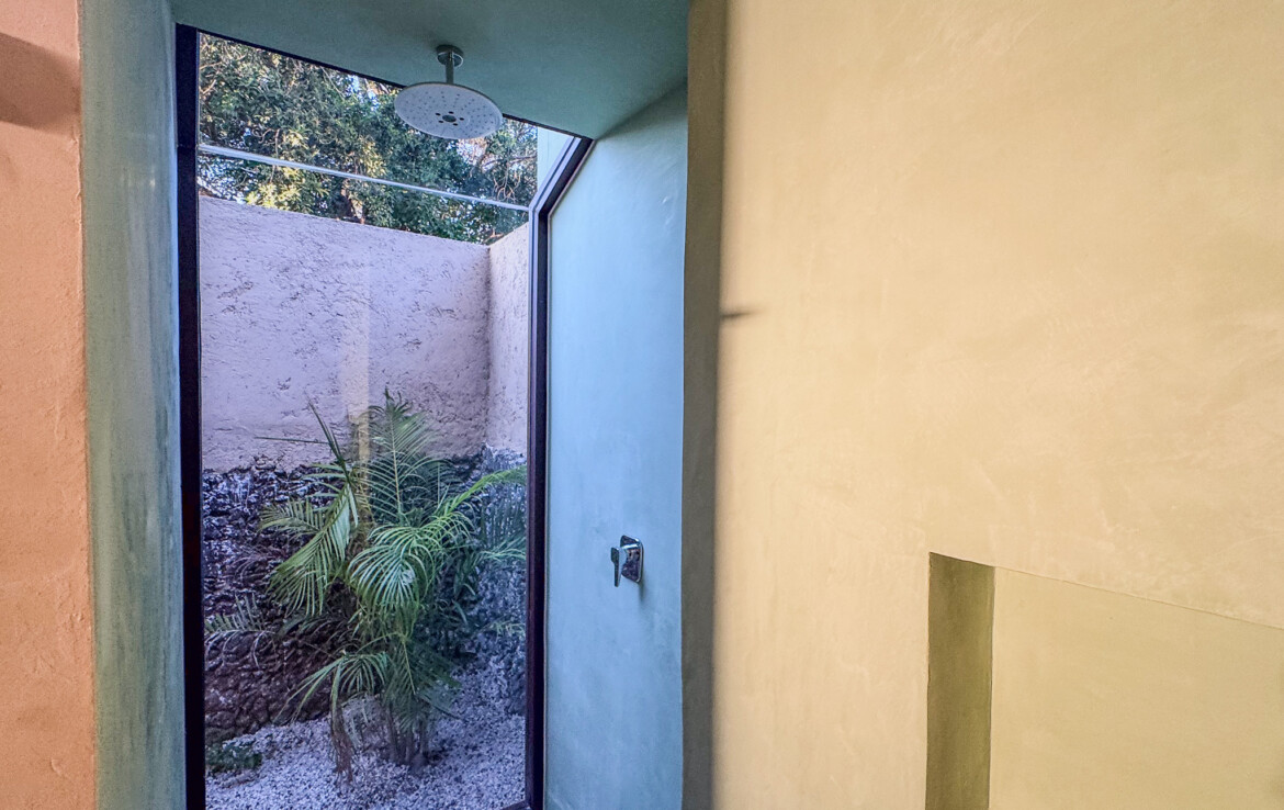 The private quarters are set within a two-story casita beyond the pool, offering both separation and tranquility. The ground-floor bedroom enjoys its own garden and a serene, spa-like bathroom, while the upper-level bedroom is equally well-appointed with fully finished closets and refined details. Beneath the casita stairs, cleverly concealed, are the home’s functional spaces including pool equipment, a laundry area, and a convenient half bath for poolside use. From the street, the home presents a modest façade, quietly concealing an inventive and sophisticated approach to tropical living. Just  completed and move-in ready, Casa Carpintero comes equipped with most appliances, air conditioning units, and ceiling fans—offering an effortless transition into refined Mérida living.