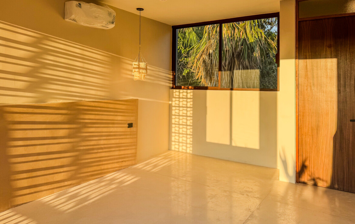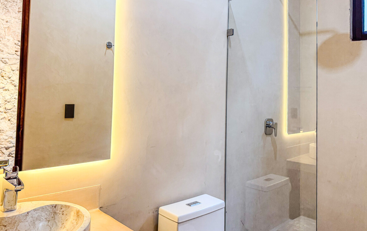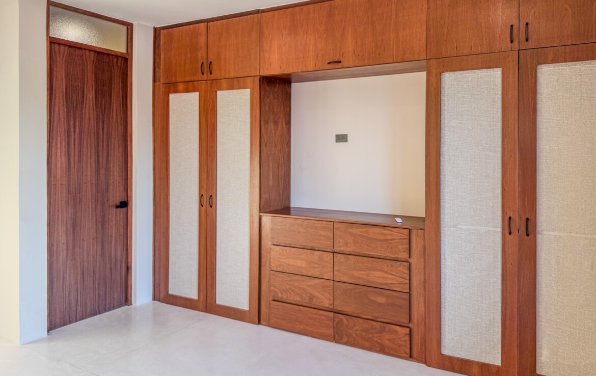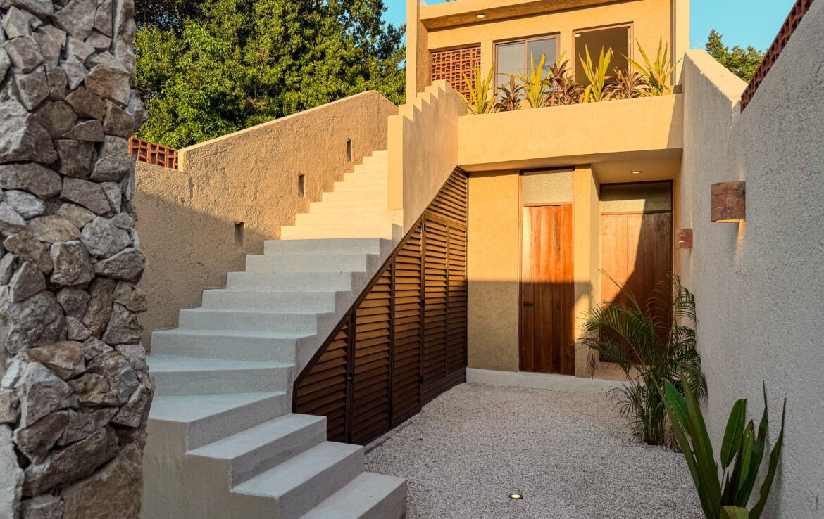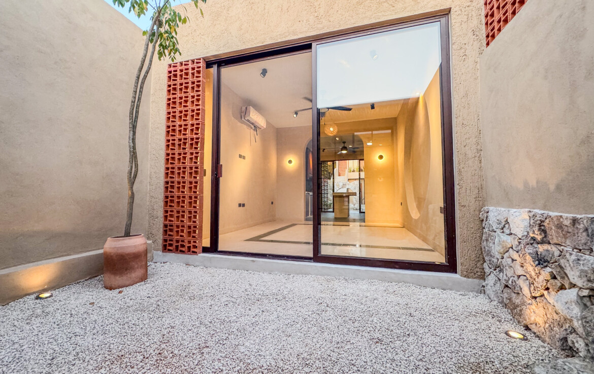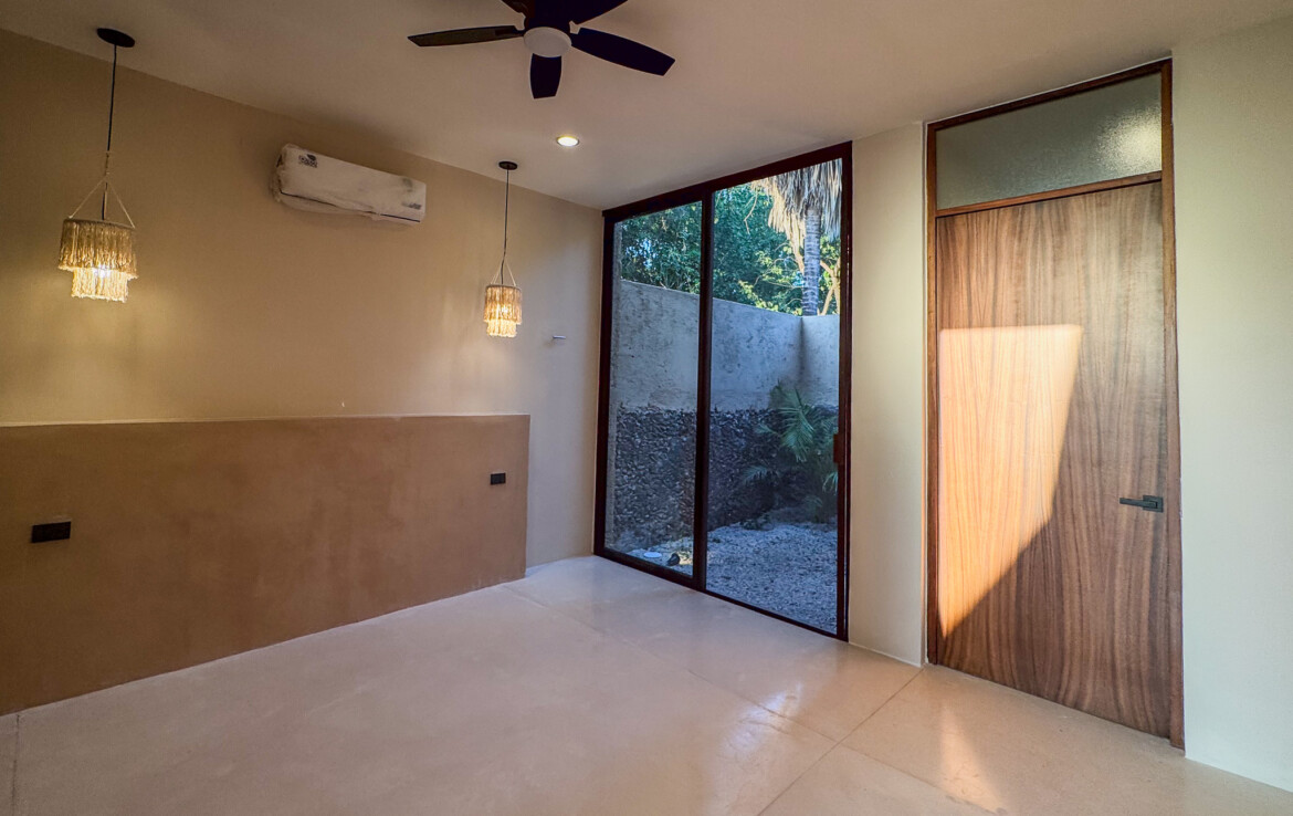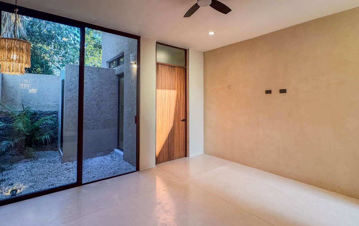 The private quarters are set within a two-story casita beyond the pool, offering both separation and tranquility. The ground-floor bedroom enjoys its own garden and a serene, spa-like bathroom, while the upper-level bedroom is equally well-appointed with fully finished closets and refined details. Beneath the casita stairs, cleverly concealed, are the home’s functional spaces including pool equipment, a laundry area, and a convenient half bath for poolside use. From the street, the home presents a modest façade, quietly concealing an inventive and sophisticated approach to tropical living. Just  completed and move-in ready, Casa Carpintero comes equipped with most appliances, air conditioning units, and ceiling fans—offering an effortless transition into refined Mérida living.