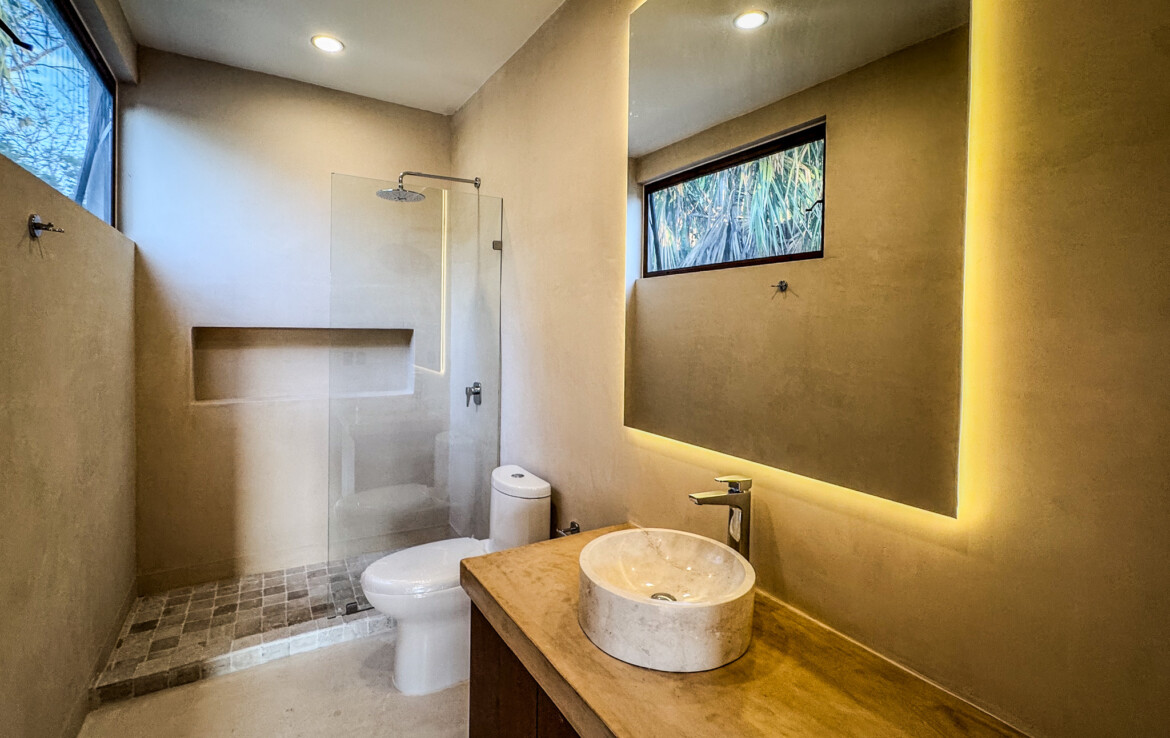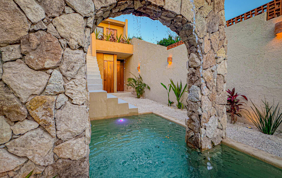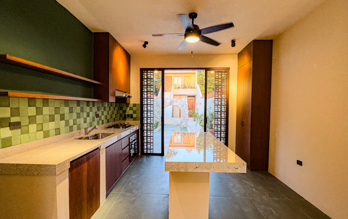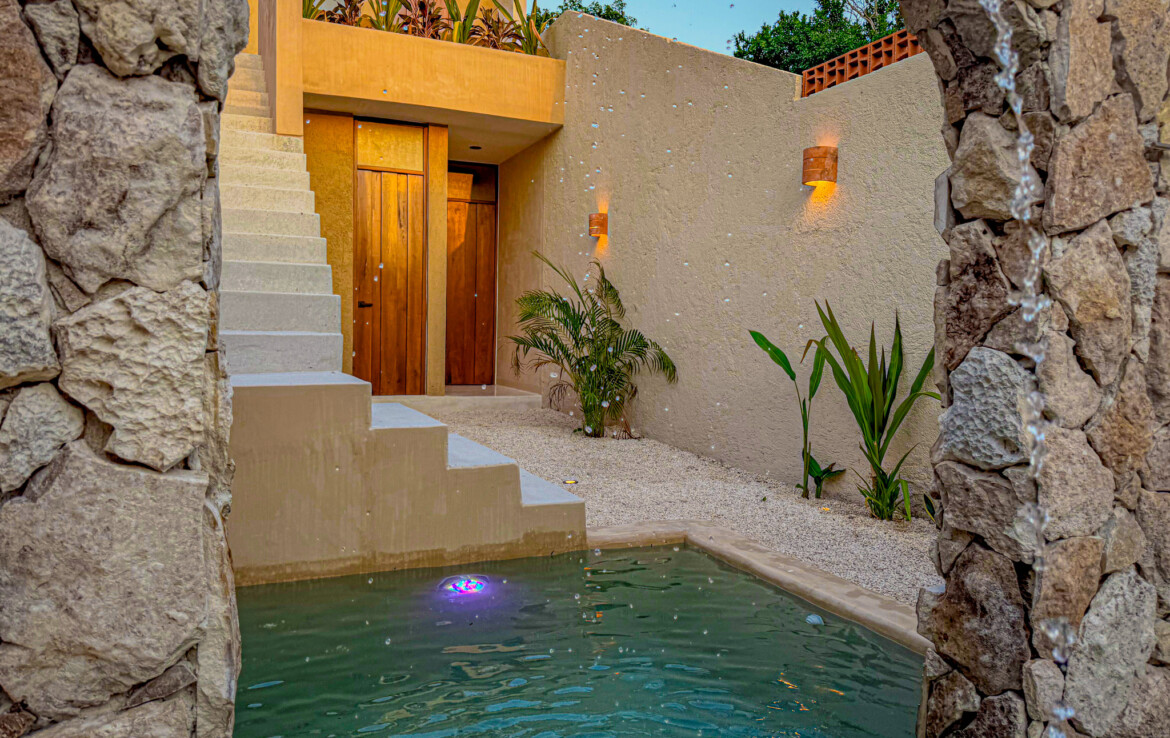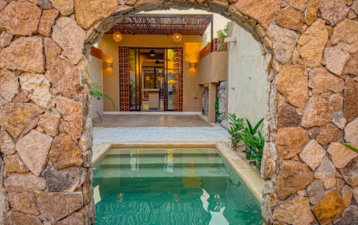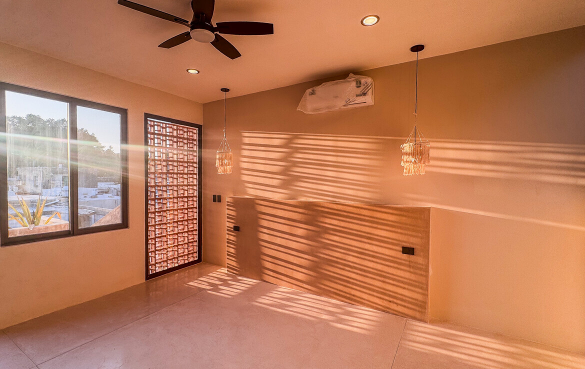 The private quarters are set within a two-story casita beyond the pool, offering both separation and tranquility. The ground-floor bedroom enjoys its own garden and a serene, spa-like bathroom, while the upper-level bedroom is equally well-appointed with fully finished closets and refined details. Beneath the casita stairs, cleverly concealed, are the home’s functional spaces including pool equipment, a laundry area, and a convenient half bath for poolside use. From the street, the home presents a modest façade, quietly concealing an inventive and sophisticated approach to tropical living. Just  completed and move-in ready, Casa Carpintero comes equipped with most appliances, air conditioning units, and ceiling fans—offering an effortless transition into refined Mérida living.