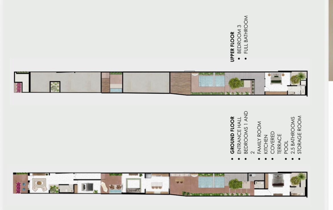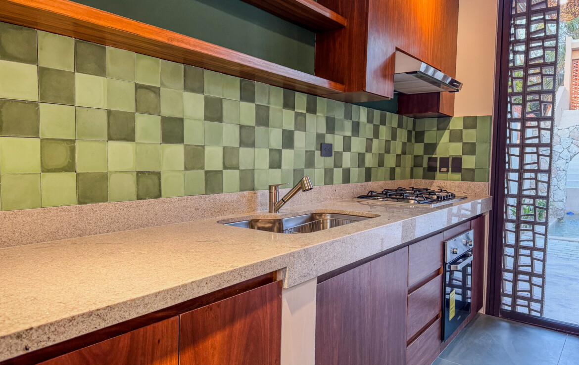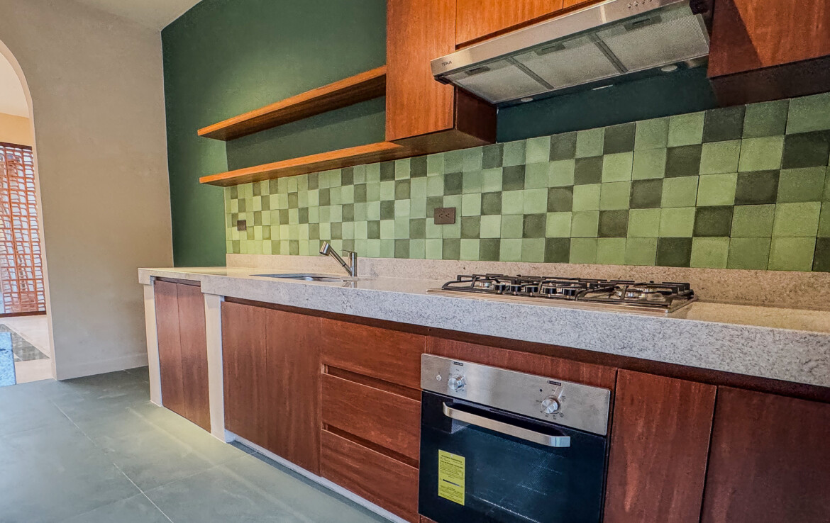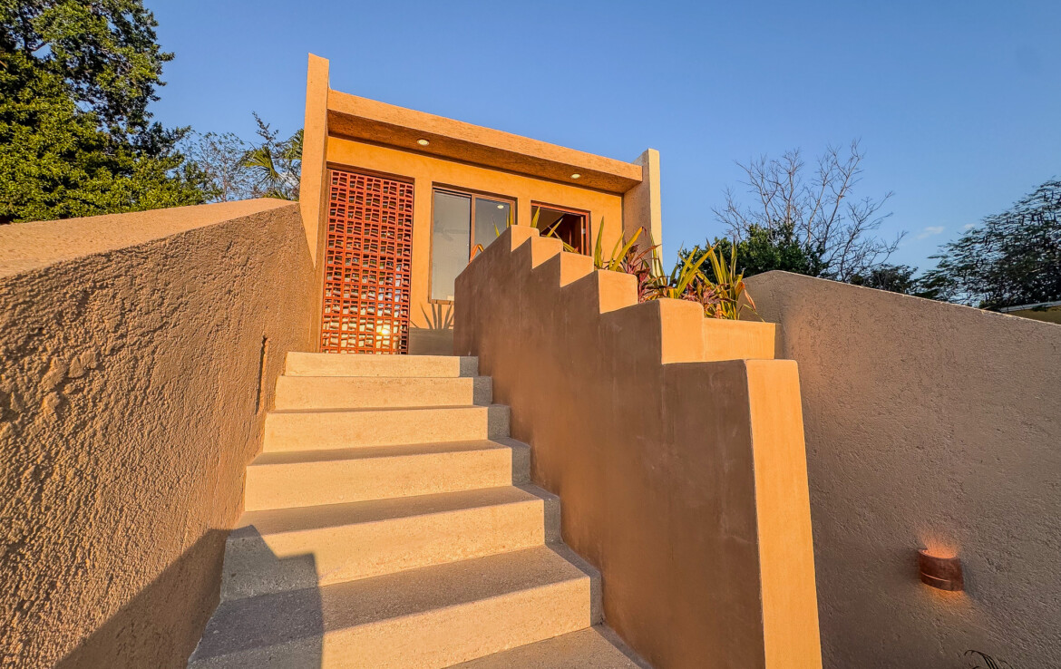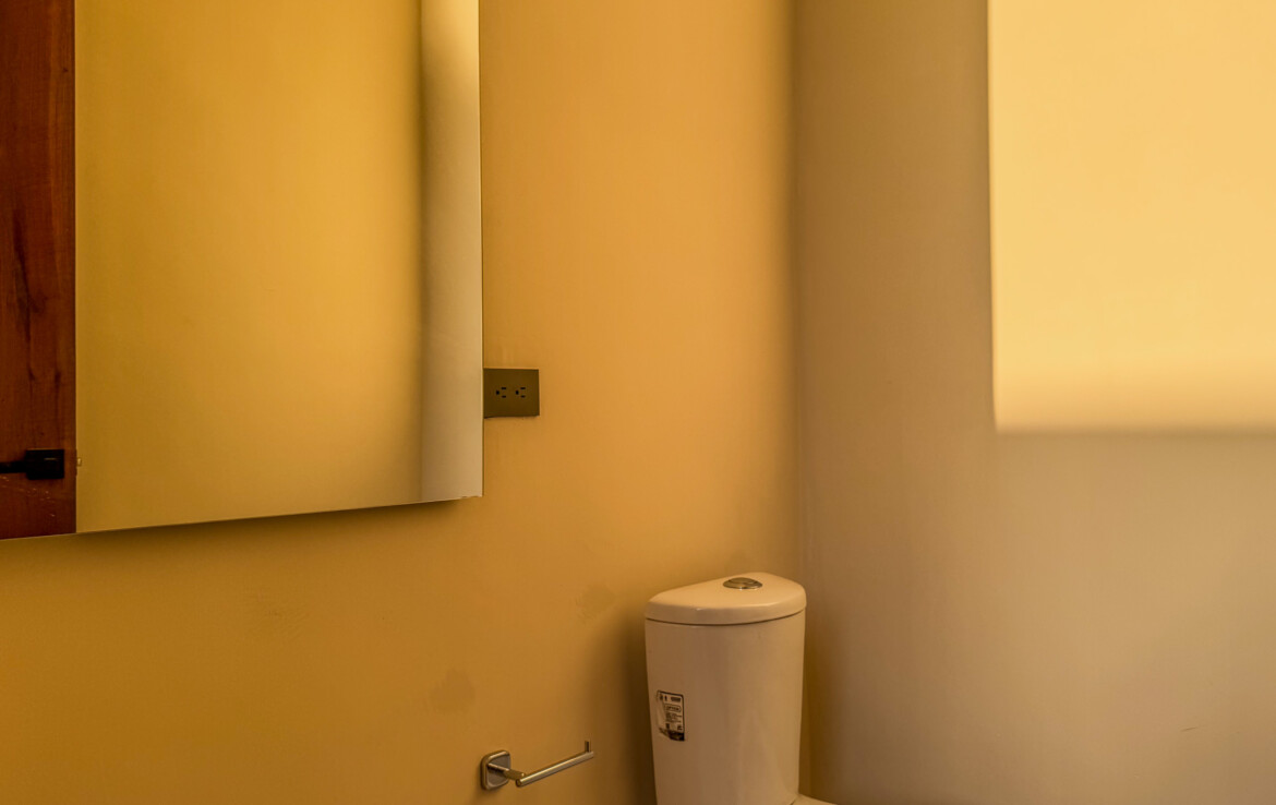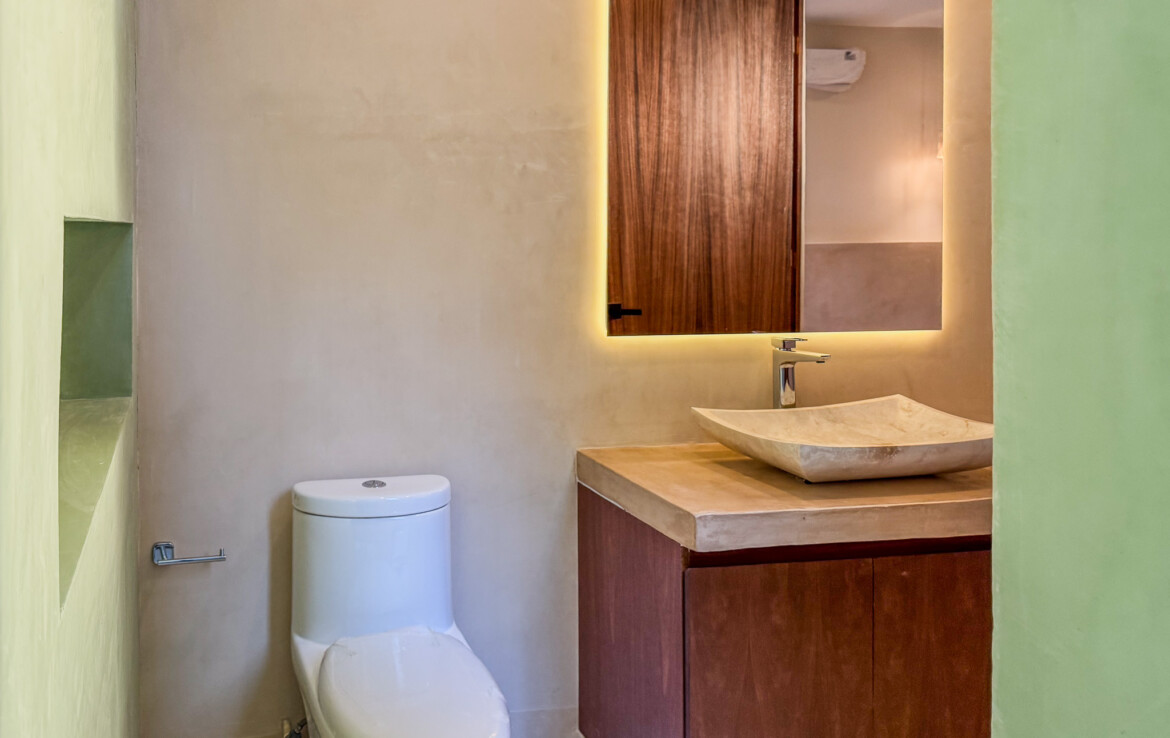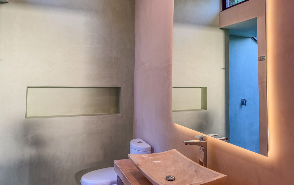The private quarters are set within a two-story casita beyond the pool, offering both separation and tranquility. The ground-floor bedroom enjoys its own garden and a serene, spa-like bathroom, while the upper-level bedroom is equally well-appointed with fully finished closets and refined details. Beneath the casita stairs, cleverly concealed, are the home’s functional spaces including pool equipment, a laundry area, and a convenient half bath for poolside use. From the street, the home presents a modest façade, quietly concealing an inventive and sophisticated approach to tropical living. Just  completed and move-in ready, Casa Carpintero comes equipped with most appliances, air conditioning units, and ceiling fans—offering an effortless transition into refined Mérida living.