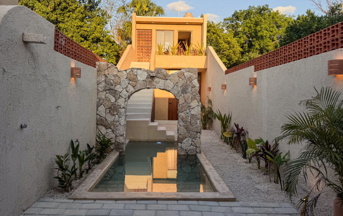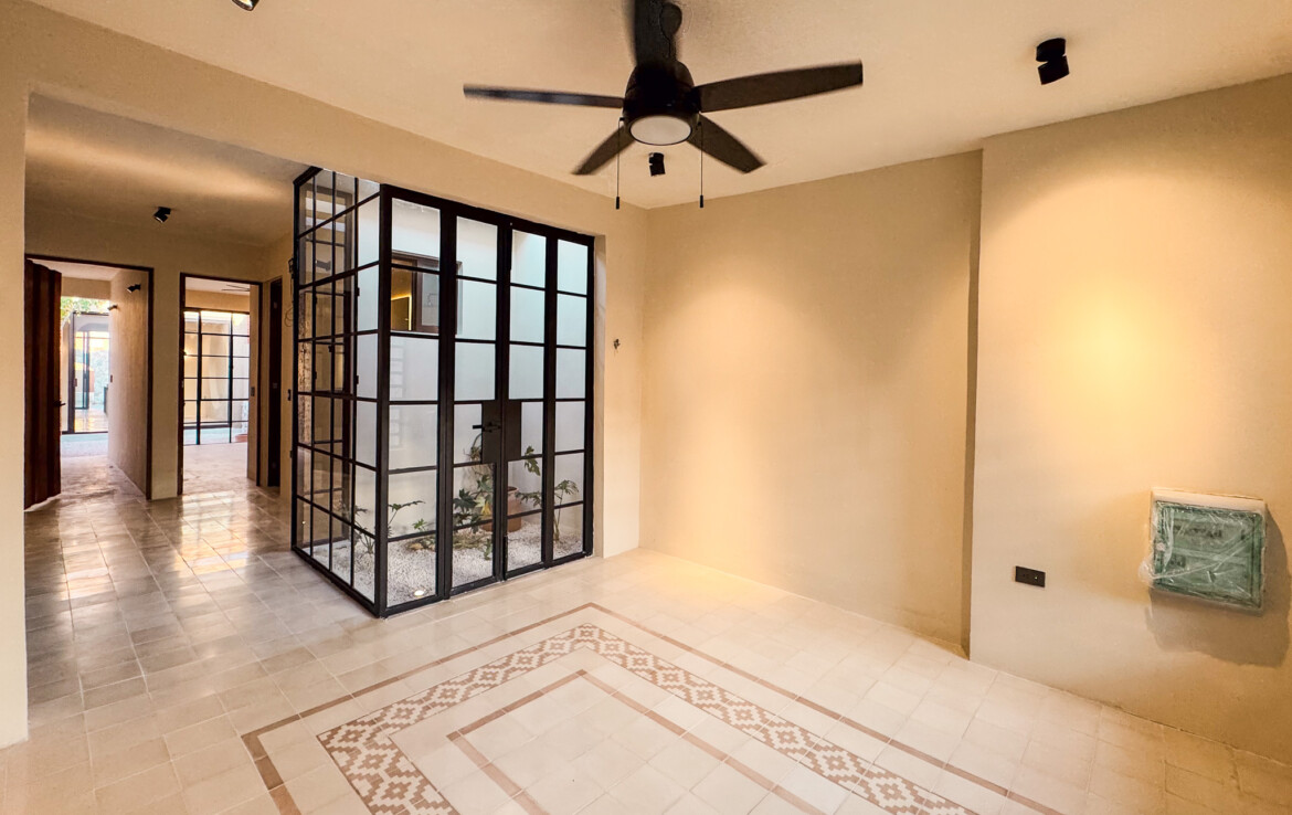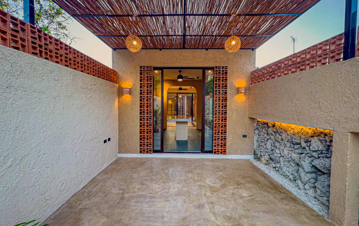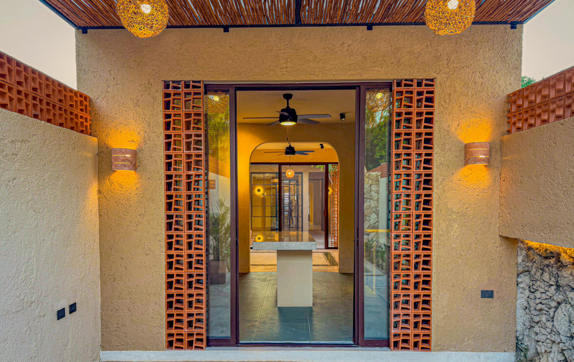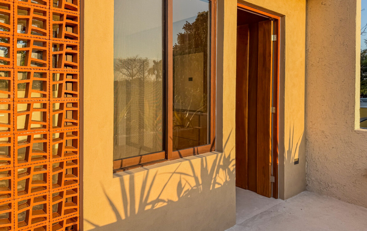 Casa Carpintero is a striking contemporary residence designed by a local architect, thoughtfully embracing the indoor–outdoor lifestyle that Mérida’s tropical climate makes possible. Set along the whole length of the property with nearly 200 square meters of construction, the home unfolds across a series of interconnected pavilions, creating a dynamic flow between living spaces, courtyards, and garden areas. While modern in concept and execution, the house harmonizes beautifully with the region’s vernacular architecture through the use of traditional materials such as red breeze block for airflow, chukum finishes, and a rich palette of flooring including pasta tile, polished cement, ceramic, and terrazzo—all blending seamlessly into a cohesive design.